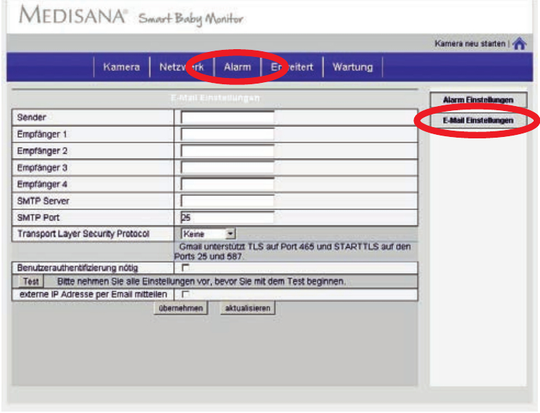 - Gehen Sie dazu auf den Menüpunkt "Alarm" und anschließend auf den Unterpunkt "E-Mail Einstellungen".