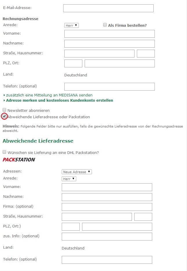Wählen Sie dazu im Bestellvorgang "Abweichende Lieferadresse oder Packstation" und geben Sie anschließend in den nun neu geöffneten Formularfeldern die notwendigen Daten an: