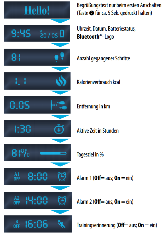 Der ViFit® Connect MX3 Activity Tracker zeigt die folgenden Informationen an: