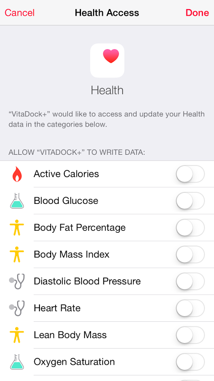 2. The Apple Health Kit connection should be displayed on startup. VitaDock will ask you for permission to transfer and update your health data into the various categories. This is designed analogous to the Health App: